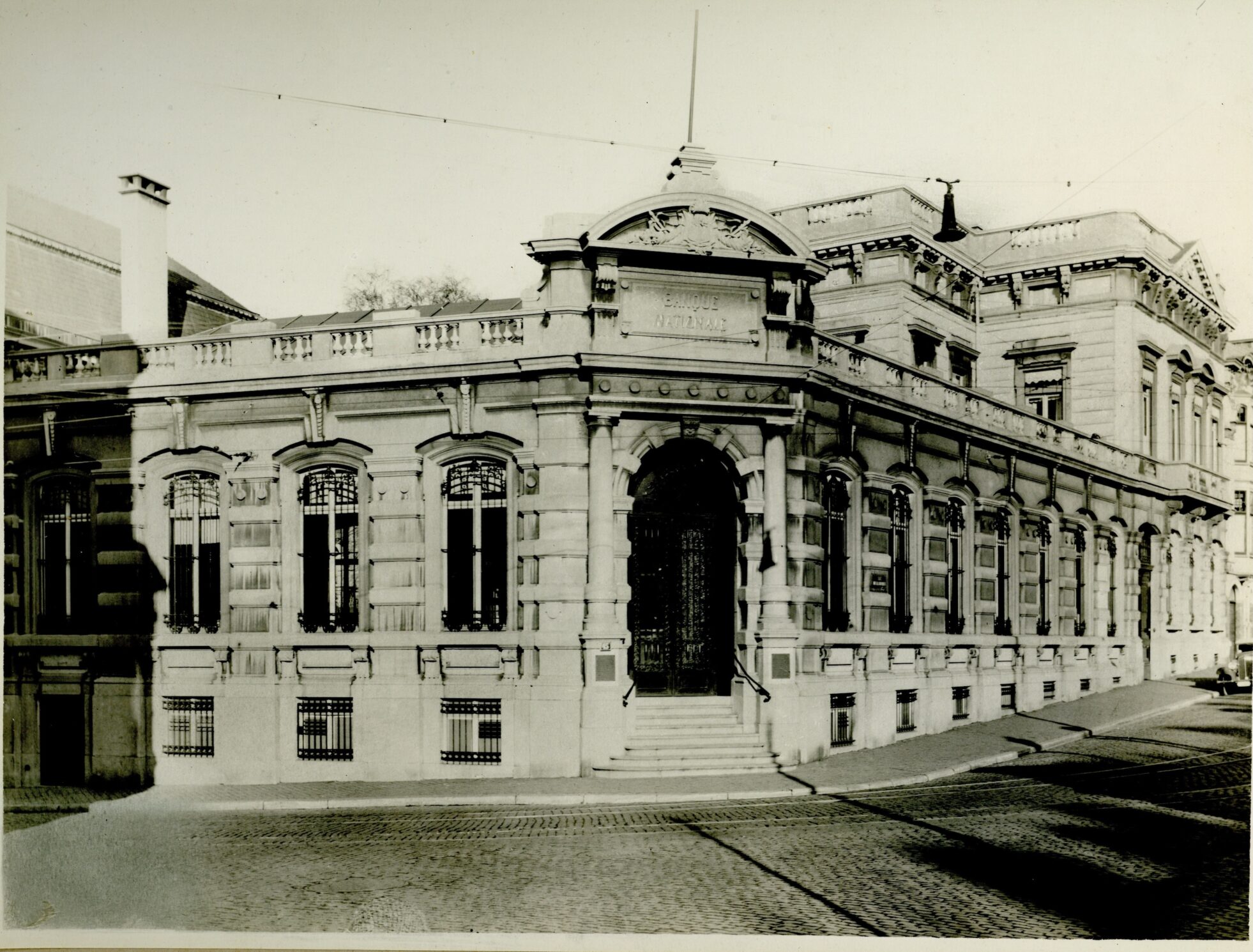 L’ancienne Banque nationale de Verviers, édifiée dans les années 1870 par l’architecte Charles Thirion, constitue un exemple significatif de l’architecture institutionnelle de la seconde moitié du XIXᵉ siècle dans la cité lainière. Implanté en milieu urbain, l’édifice se caractérise par une écriture monumentale et ordonnée, en adéquation avec la fonction bancaire qu’il abritait. Le vocabulaire formel, proche du néoclassicisme éclectique privilégié par Thirion, met en avant la symétrie de la composition, la lisibilité des volumes et l’usage de matériaux nobles, traduisant les valeurs de stabilité et de prestige propres à l’institution. Fort d’une expérience reconnue dans le domaine des édifices bancaires, Charles Thirion réalise de nombreux autres bâtiments du même type, notamment pour le Crédit Anversois (1896-1917) et pour l’Union du Crédit (1897).