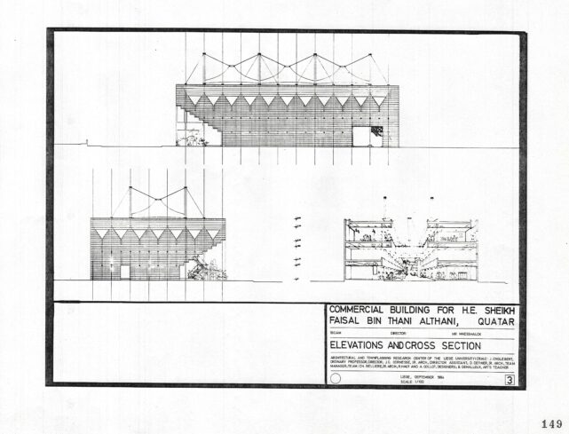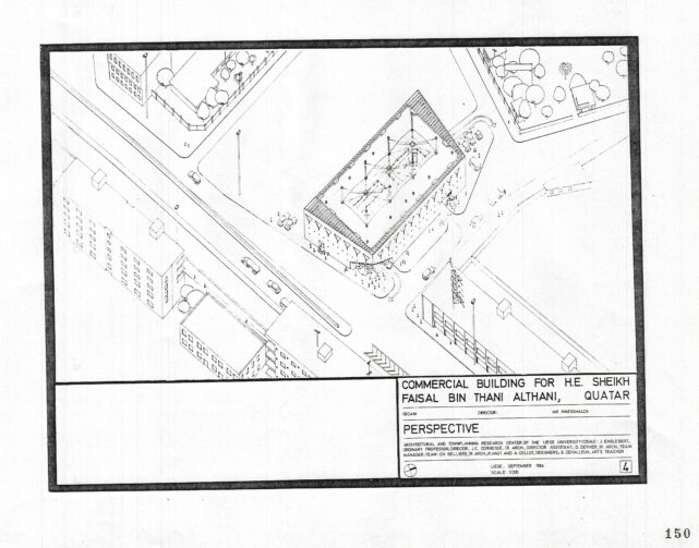 Le CRAU (Centre de Recherches d’Architecture et d’Urbanisme) est fondé par le professeur Jean Englebert en 1967. Il y mène une production architecturale qui sert de support au travail de recherche au sein de l’Université de Liège. Le CRAU voit passer en son sein de nombreux architectes, notamment, pour ce projet, Jean-Claude Cornesse, ingénieur architecte, en tant qu’assistant de direction et Daniel Dethier, ingénieur architecte, en tant que chef d’équipe. La genèse du projet de centre commercial à Doha remonte à 1984 et constitue un exemple des collaborations internationales pour le CRAU. Commandité par Son Excellence Faisal bin Thani bin Faisal Al Thani, le centre commercial de 1.450m2 au sol se développe autour d’une cour intérieure. Le projet compose avec le contexte climatique particulier de Doha en occultant l’ensoleillement direct grâce aux trois toiles qui couvrent la cour et à un recul des fenêtres de 1m50 par rapport à la façade. Ces dernières permettent d’attirer le regard depuis l’autoroute voisine grâce à un jeu de pleins et de vides recréant en négatif les arcs en ogives locaux ici réinterprétés.