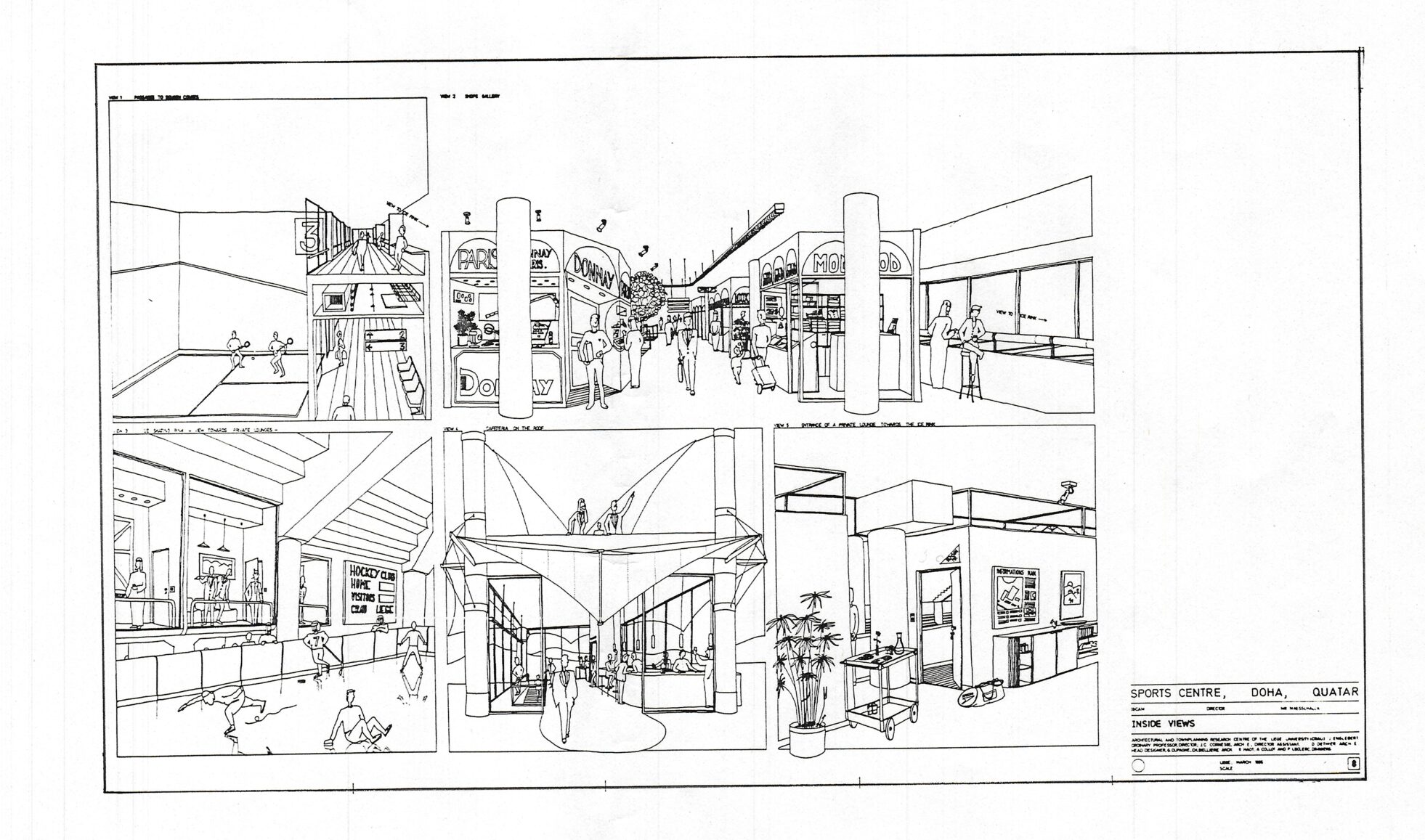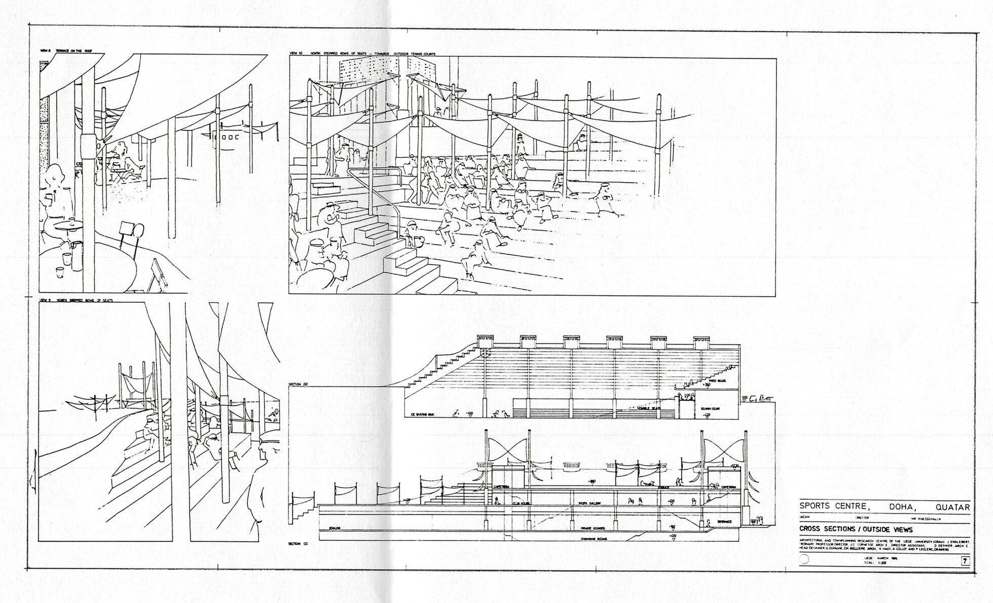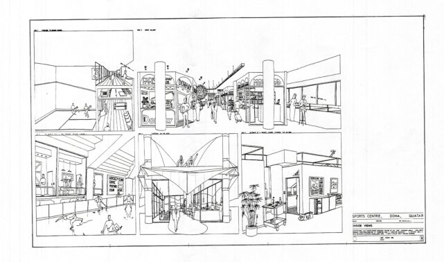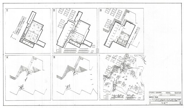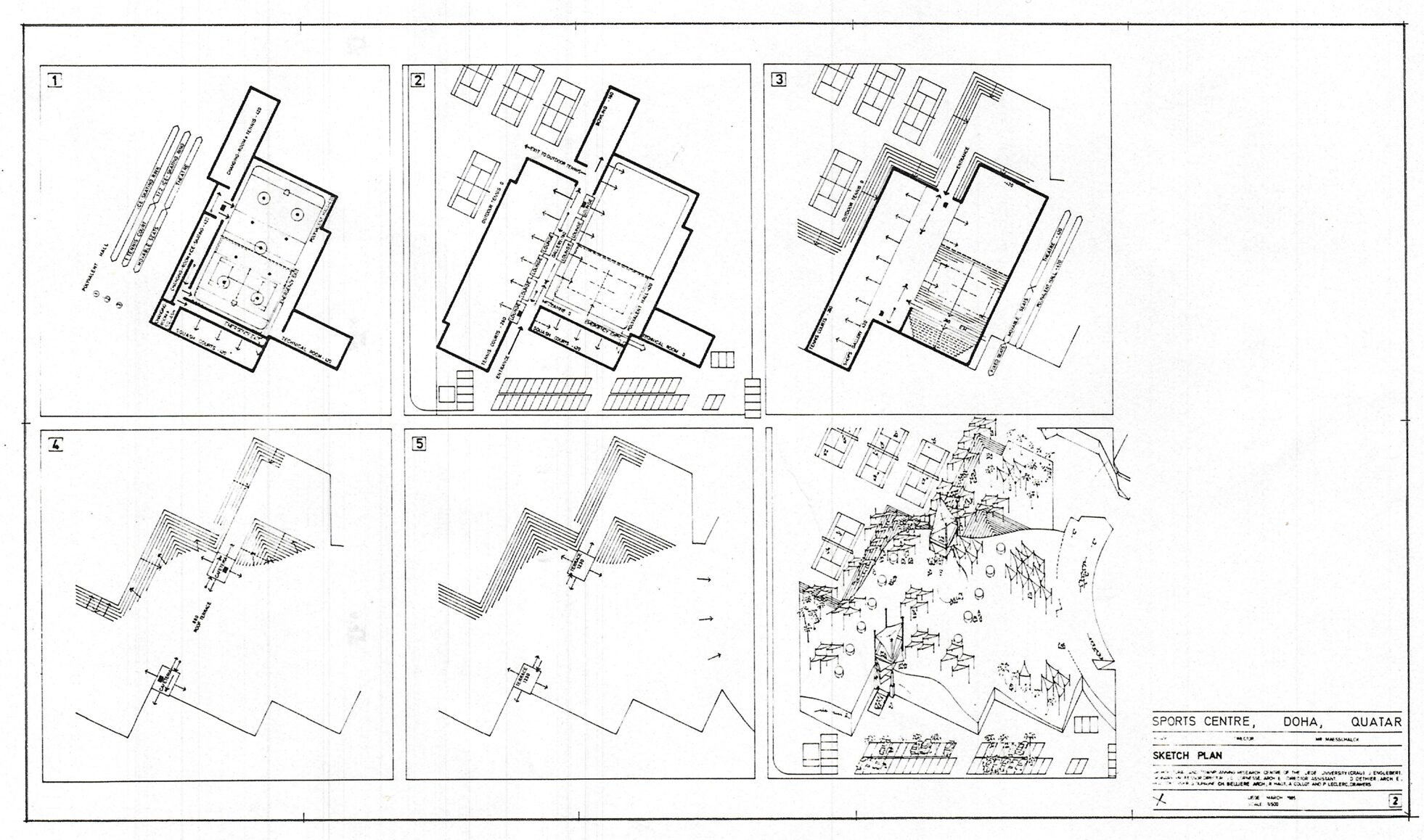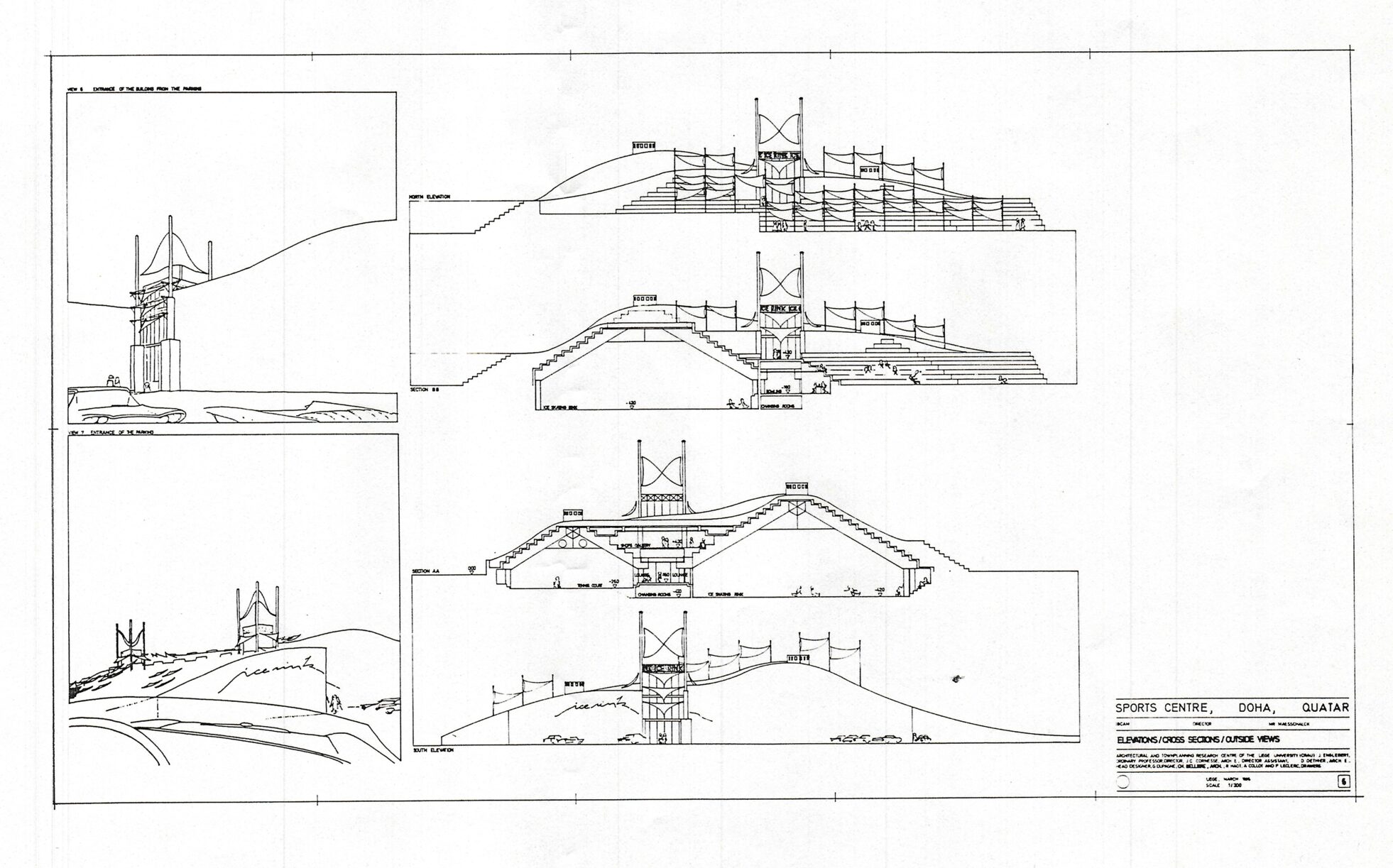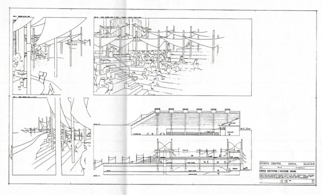 Ce projet non-réalisé de centre sportif à Doha au Qatar est un des exemple des collaborations internationales menées par le CRAU (Centre de Recherches en Architecture et Urbanisme de l’Université de Liège) dans les années 1970-1980. Le projet, conçu par Daniel Dethier sous la direction de Jean Englebert et Jean-Claude Cornesse en 1986, concilie un programme ambitieux et complexe de 8.000m2 de centre sportif au contexte climatique et paysager qatari. Les bâtiments recouverts de terre et de sable forment des dunes artificielles abritant des gradins. L’ensemble est recouvert de toiles, maintenues par des structures métalliques et offrant de l’ombre aux spectateurs des cours de tennis et des pistes d’athlétisme. L’architecture tente dans un même geste de se fondre dans le paysage et d’y créer un microclimat pour le confort des usagers.