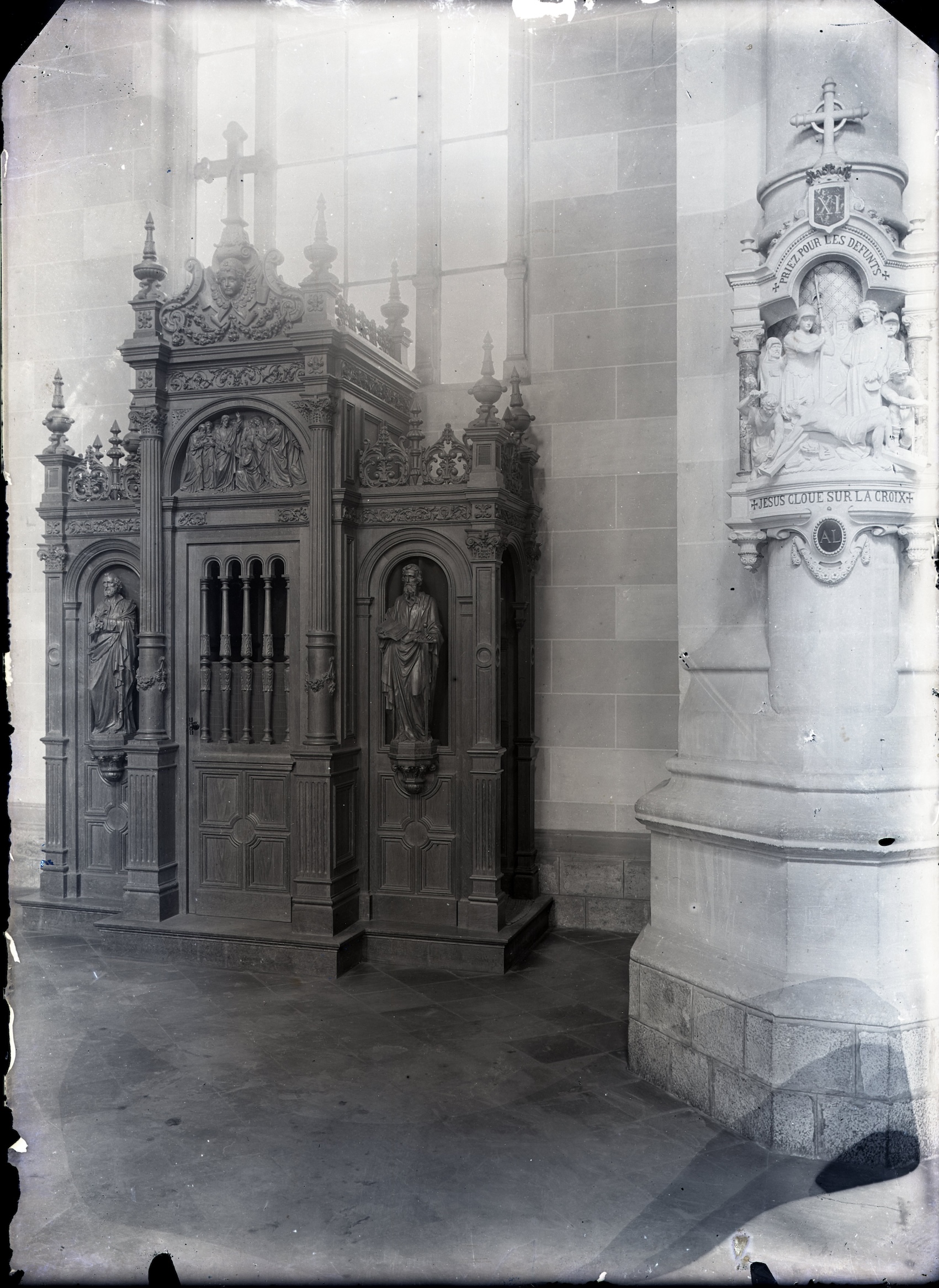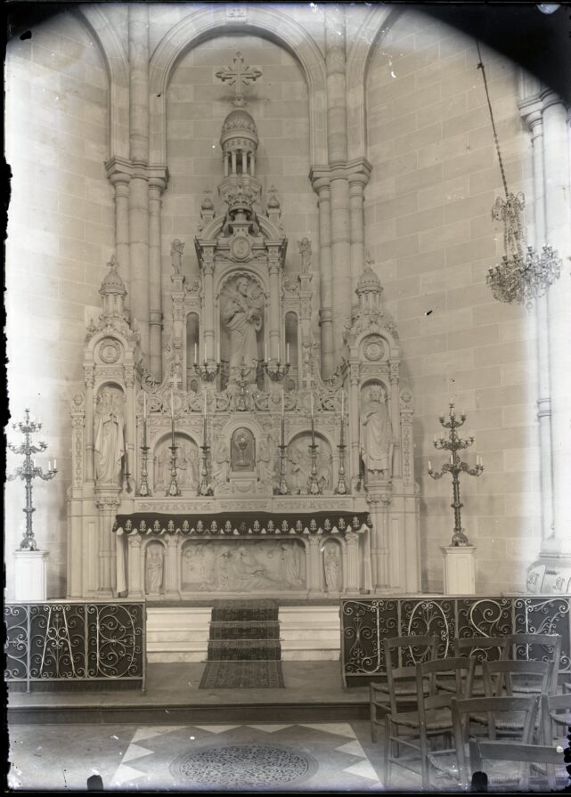 Plusieurs clichés représentent l’intérieur de l’église Notre-Dame du Sacré-Cœur d’Armentières. On y distingue un confessionnal richement décoré ainsi qu’une station de chemin de croix épousant la forme d’une colonne. L’ensemble est traité dans un style néorenaissance. Les statues encadrant la porte du confessionnal représentent saint Pierre à gauche et saint Paul à droite. Le tympan figure un épisode rapporté par trois des quatre Évangiles (Mt 16, 13-20 ; Mc 8, 27-30 ; Lc 9, 18-21), dont le récit selon saint Matthieu a directement inspiré l’iconographie. Jésus y déclare à Pierre : « Je te donnerai les clés du Royaume des cieux : tout ce que tu auras lié sur la terre sera lié dans les cieux, et tout ce que tu auras délié sur la terre sera délié dans les cieux ». Dans le langage biblique, « lier » et « délier » signifient exercer une autorité spirituelle, notamment pour retenir ou remettre les fautes. Cet épisode fonde ainsi le sacrement de pénitence, dont le confessionnal constitue le lieu concret. L’atelier Verlinden a choisi de représenter le moment précis où Pierre, agenouillé, reçoit les clés du Royaume, figurées comme des objets matériels. La station du chemin de croix visible sur le cliché correspond à la station n° XI : Jésus cloué sur la croix. Un médaillon situé dans la partie inférieure porte les lettres A. L., probablement les initiales du donateur. Dans la partie supérieure, l’inscription « Priez pour les défunts » rappelle les dévotions annexes associées à la pratique du chemin de croix. Une autre vue montre la chapelle de Saint Joseph, où se dresse l’autel dédié au saint, de style néorenaissance, œuvre de l’atelier Verlinden. L’ornementation de l’autel mêle de manière libre et foisonnante des éléments de l’architecture classique – colonnes cannelées, chapiteaux, portique – à des motifs d’inspiration médiévale, auxquels s’ajoutent des fleurs de lys, attribut symbolique de saint Joseph. Le résultat est un ensemble particulièrement riche et spectaculaire. Au-dessus du tabernacle, devant un portique de style classique, se reconnaît la statue de Saint Joseph portant l’Enfant Jésus. Dans la partie supérieure, ce portique se prolonge et s’élève pour se transformer en flèche. L’autel se distingue par la profusion de figures angéliques : putti tenant des tiges de lys au sommet du portique, anges adorateurs encadrant la porte du tabernacle, masques de séraphins le long de la faîtière, ange en prière sur le tombeau de l’autel, ainsi qu’anges psychopompes accompagnant la scène figurée sur ce même tombeau. Les pilastres latéraux portent les statues d’Abraham à gauche et du roi David à droite. Les initiales entrelacées « SA » et « SD », placées au-dessus des statues, renvoient respectivement à Saint Abraham et Saint David. Les scènes figurées sur le retable représentent, à gauche, le mariage de Joseph et Marie, et à droite, la Fuite en Égypte. Sur le tombeau de l’autel, entre deux anges en prière, est représentée la Mort de saint Joseph dans les bras de Jésus et de Marie. La clôture de la chapelle, portant le nom de Joseph, pourrait également être l’œuvre de l’atelier Verlinden ; la réalisation de grilles et d’ouvrages métalliques faisant aussi partie de ses spécialités. L’ensemble a été détruit lors de la Première Guerre mondiale.