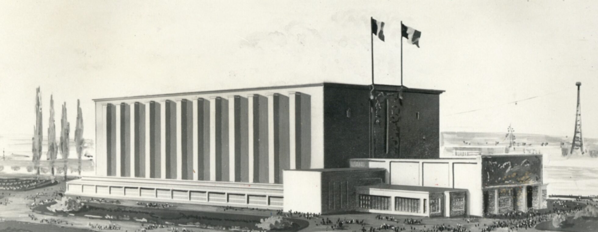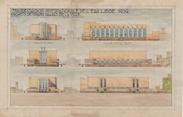 Avec la plaine de jeux reine Astrid, le Palais permanent de la Ville de Liège est l’un des derniers bâtiments pérennes de l’Exposition de 1939. Jean Moutschen est à peine entré dans la trentaine lorsqu’il se lance dans la conception du bâtiment phare de l’exposition. Édifié en un an et conçu dès l’origine comme patinoire, l’édifice est équipé d’un plancher amovible ainsi que d’une scène coulissant sur des rails suspendus, afin de pouvoir accueillir des manifestations d’autres natures comme des spectacles ou des concerts. À l’époque, il s’agit de la plus vaste patinoire de Belgique et de l’une des plus importantes d’Europe. Longue de 90 m, large de 40 m et haute de 19,5 m, la salle principale se distingue par un immense volume sans appuis intermédiaires, rendu possible par une ossature en béton. Chauffée par air pulsé, elle est éclairée par une toiture à sheds soutenue par des contreforts extérieurs. La véritable prouesse réside toutefois dans la tribune suspendue en béton, offrant 781 places et portée sur 42 m. Autour de ce grand espace se greffent divers locaux – salles de conférence, de réception, puis plus récemment espaces sportifs. La fonctionnalité domine la conception du bâtiment, dont la sobriété est adoucie par un parement de plaques en terre cuite déclinant une gamme chromatique du violet foncé au rouge clair. Comme pour le lycée de Waha, Moutschen fait appel à des artistes, fidèle à son engagement en faveur d’un dialogue étroit entre architecture et arts plastiques dans les édifices publics. Le sculpteur A. Salle réalise deux bas-reliefs, un buste et un Dionysos dansant au rythme du tambourin. L’œuvre la plus remarquable reste cependant le grand bas-relief d’Adolphe Wansart, qui couvre toute la largeur de l’entrée principale : Liège, les Sciences et les Arts. De part et d’autre de l’allégorie de la Ville se déploie un panorama de l’histoire industrielle et culturelle liégeoise : à gauche, la muse de l’électricité fait face à l’armurier et au Val Saint-Lambert ; à droite, la muse des arts et des sciences domine les allégories artistiques, ainsi que Grétry et Franck. Le style oscille curieusement d’une figure à l’autre entre stylisation et réalisme.