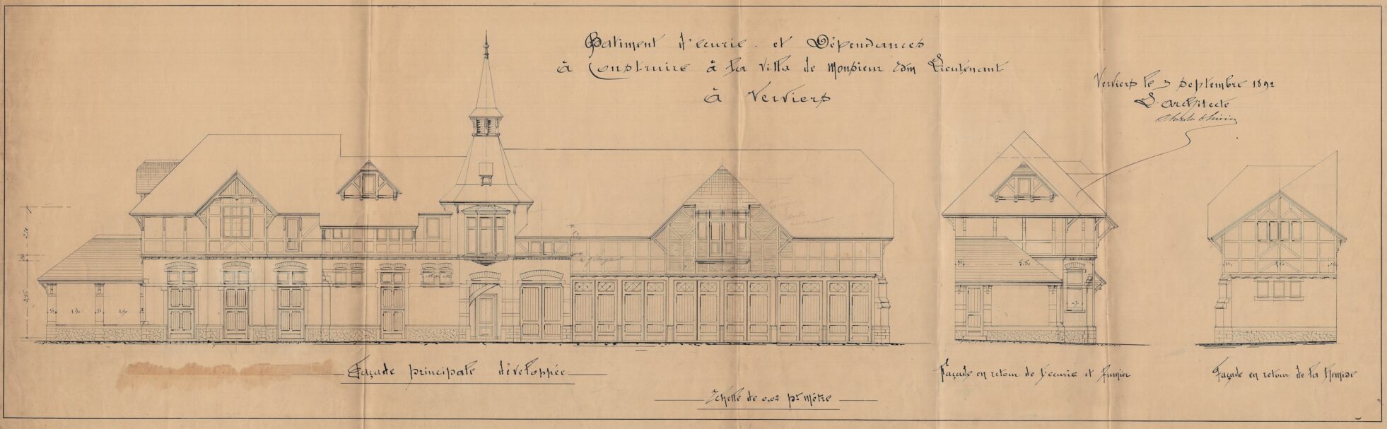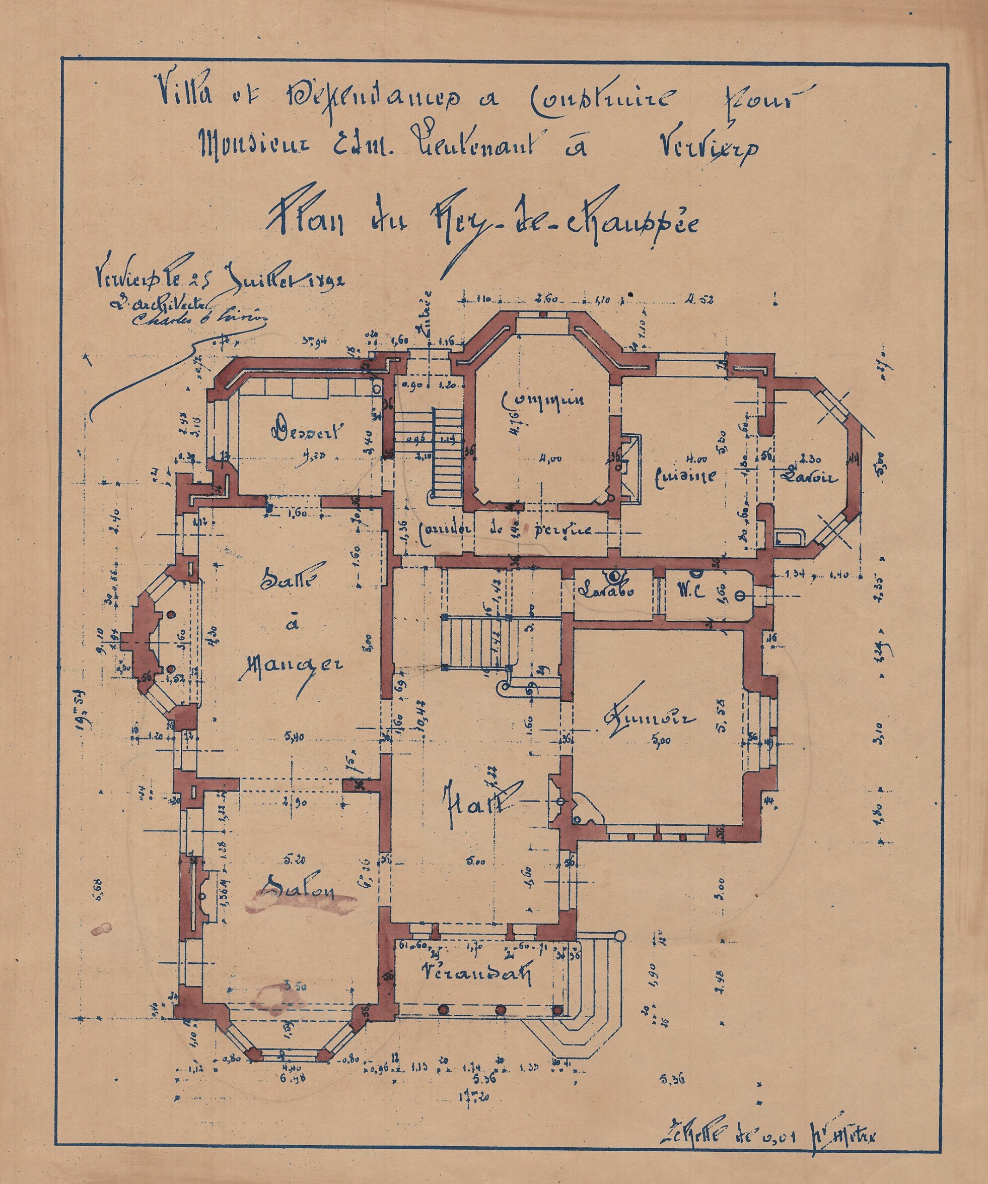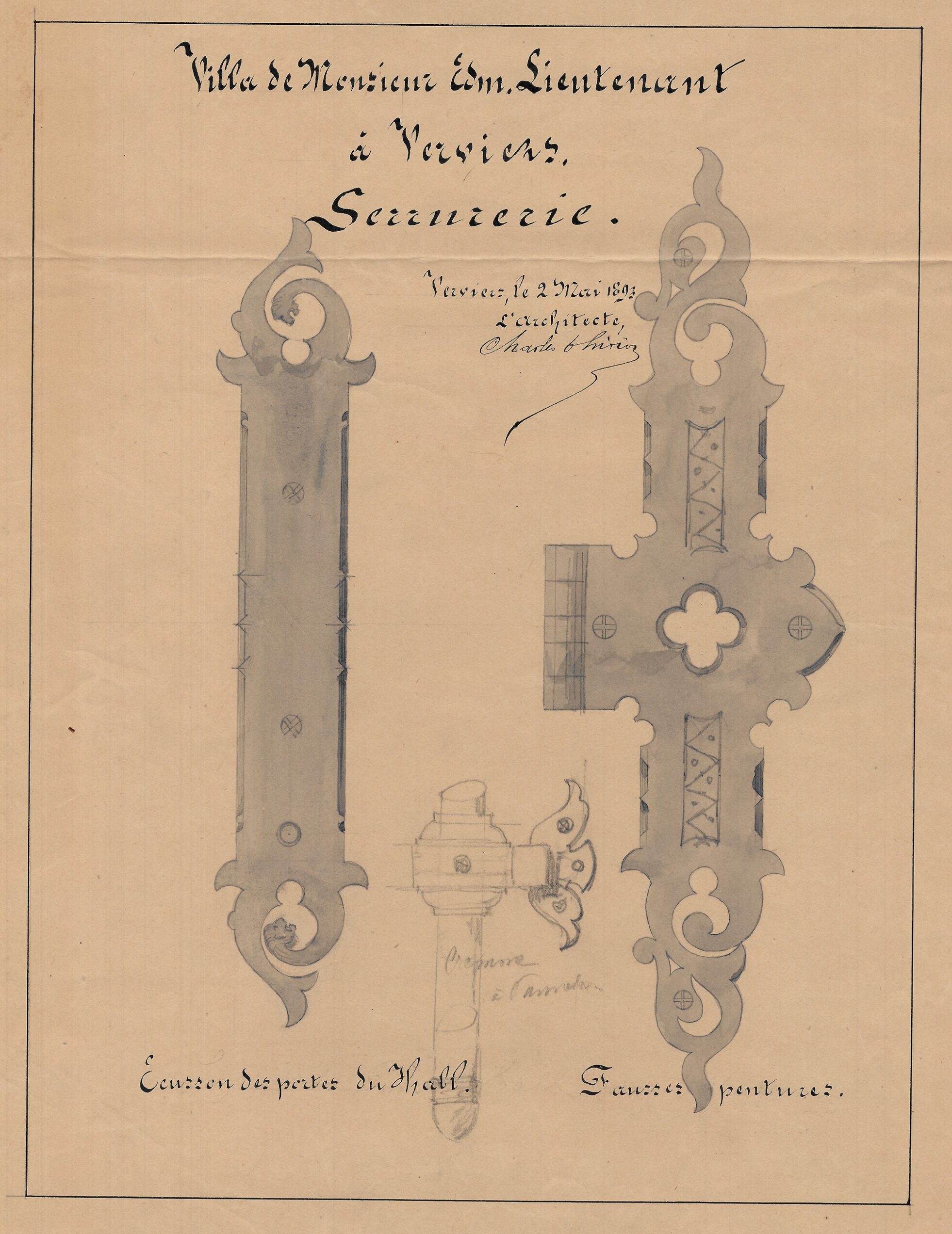 En 1892, cinq ans après son mariage avec Anne-Justine Hauzeur, Edmond Lieutenant, riche industriel verviétois, confie la conception de la villa conjugale à Charles Thirion. Le maître d’ouvrage dispose d’un vaste terrain idéalement situé dans un secteur de la ville en pleine expansion, à proximité du futur théâtre en construction et de la future gare, dont les expropriations commencent quelques années plus tard. Le terrain, en promontoire, domine le parc de l’Harmonie. Construite en brique et soulignée de chaînages et d’encadrements en petit granit, la villa s’inscrit dans l’esthétique des demeures de la fin du XIXᵉ siècle. Avec ses volumes complexes et asymétriques, ses multiples ailes, ses avancées et ses décrochements, elle témoigne du statut social de son maître d’ouvrage. Les toitures pentues en ardoise sont ponctuées de nombreux pignons, de lucarnes et de hautes cheminées, tandis qu’une petite tour centrale surmontée d’un lanternon domine l’ensemble. Un perron couvert ainsi qu’un balcon sont tournés vers la rue d’Ensival. Attentif aux détails, Thirion dessine de nombreux éléments comme les serrureries ou divers éléments en fer forgé en leur donnant une valeur décorative dans le ton de l’époque. À la villa, le commanditaire adjoint un généreux pavillon destiné aux écuries et aux dépendances. En 1910, Edmond Lieutenant quitte la villa pour s’installer à Tilff.