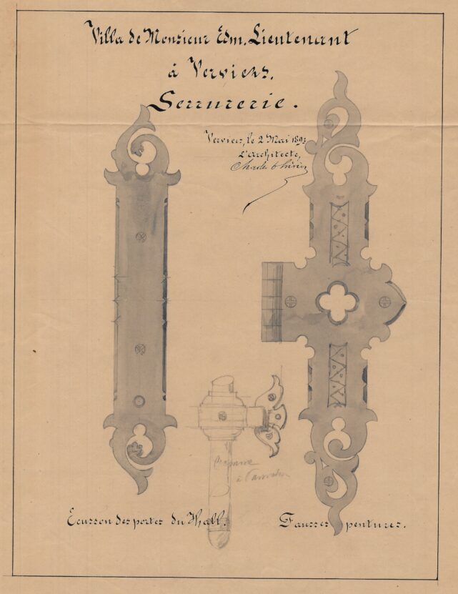 Contient deux photographies (façade et intérieur), façade, plan de l’étage du bâtiment des écuries et des dépendances, commande des lucarnes de toiture, façade principale, plan des différents niveaux, plan et élévation du porche, détail des ferronneries. Contient 26 documents.