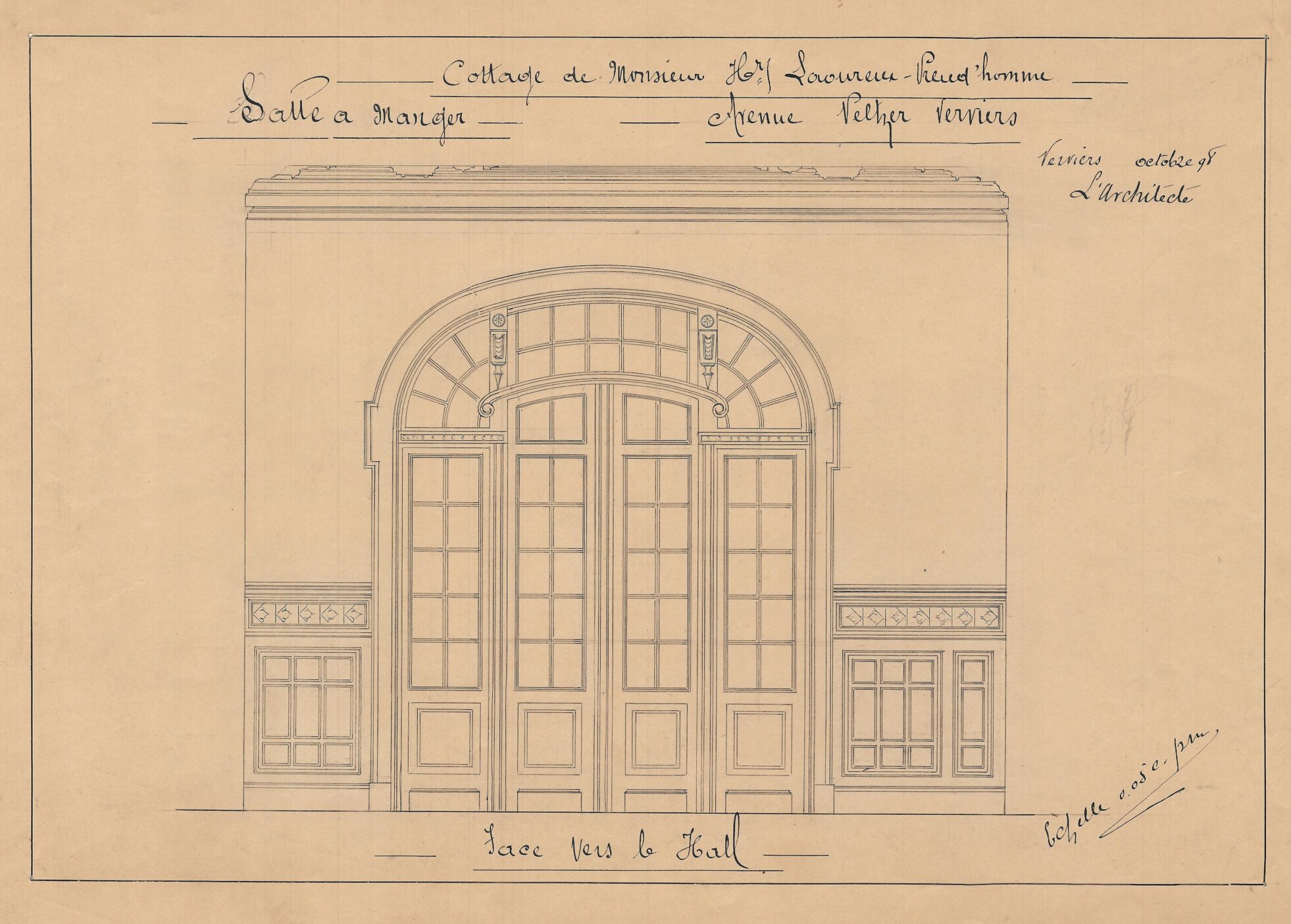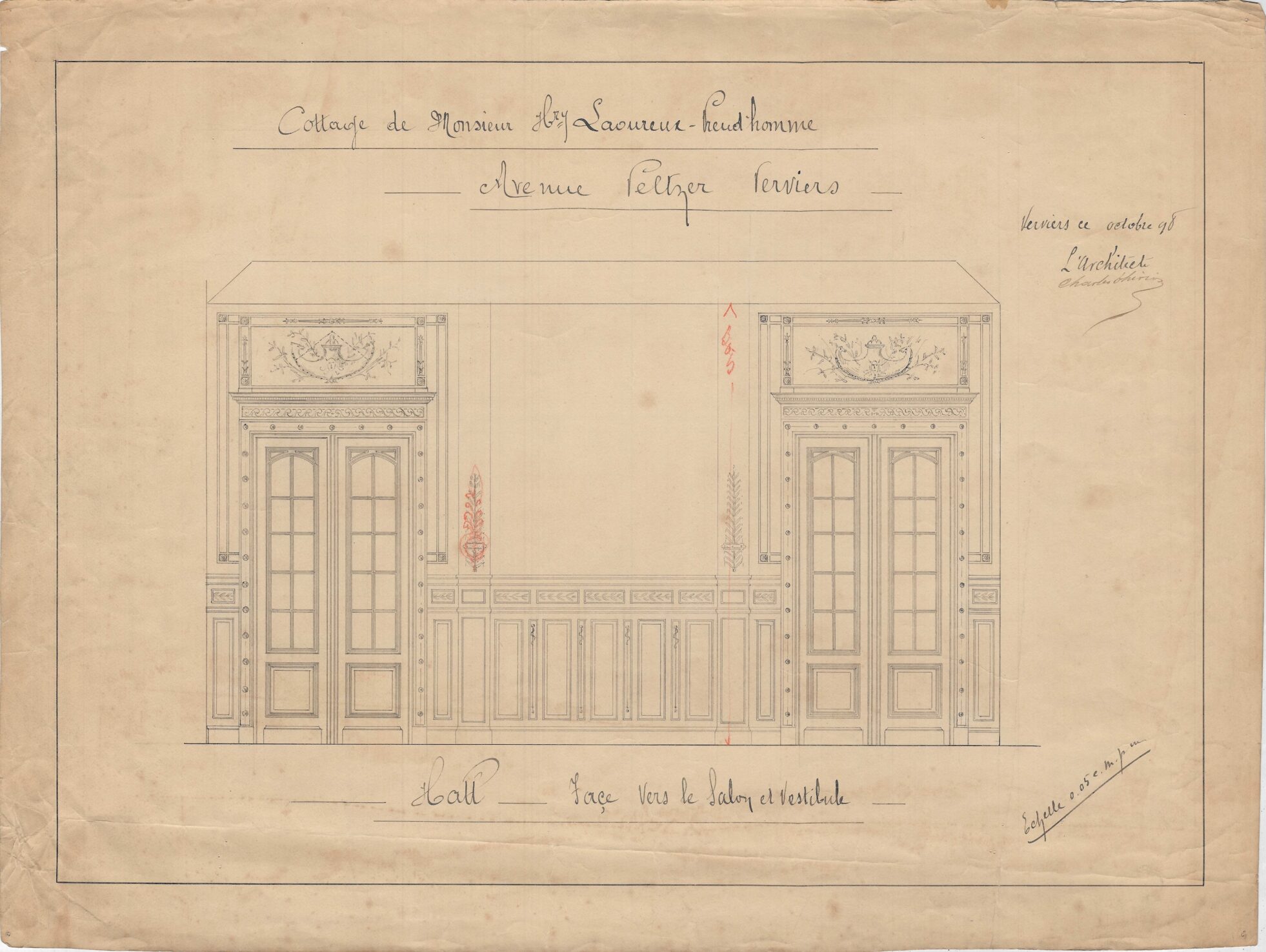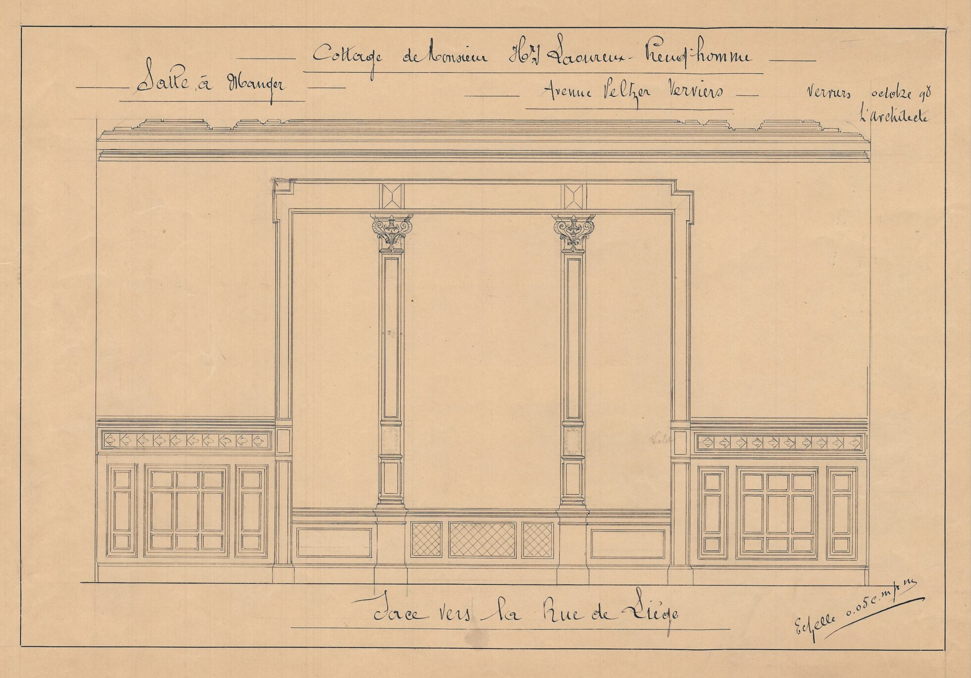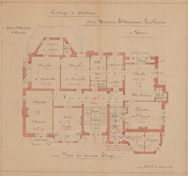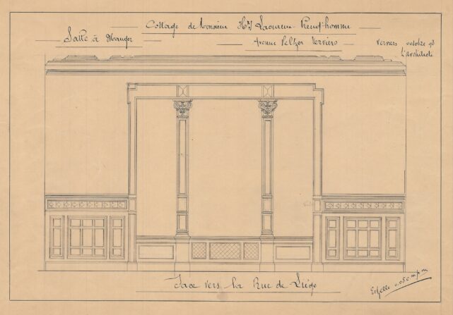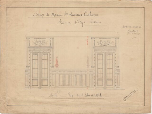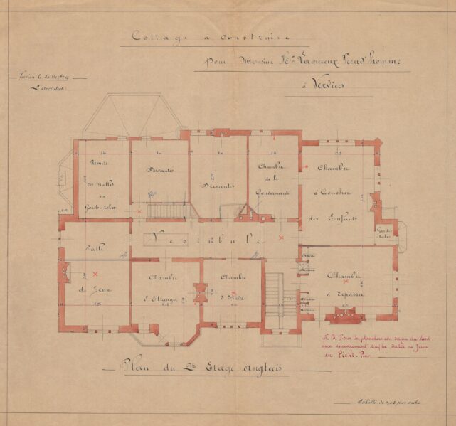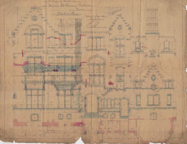 À la fin du XIXe siècle, Charles Thirion multiplie les commandes, en particulier auprès de la haute bourgeoisie verviétoise. Commandé par le couple Laoureux-Preud’Homme, cet imposant édifice – davantage apparenté à un château qu’à une simple villa – s’implante sur un terrain acquis à la famille Peltzer. Situé sur les hauteurs de Verviers, l’emplacement s’inscrit dans un quartier alors en plein essor, devenu un lieu privilégié pour les grandes familles industrielles de la région. Implanté au centre d’une vaste parcelle, le bâtiment adopte un style éclectique affirmé. Il repose sur un soubassement en moellons de grès et développe des élévations en briques, rythmées par des éléments en petit granit. Les façades, particulièrement soignées, se distinguent par leur richesse ornementale et par l’intégration de références aux styles néo-Renaissance flamande et néo-gothique Tudor, visibles dans le traitement des baies, des pignons et des décors. Dans les années 1920, l’édifice quitte le cadre familial pour être vendu et reconverti en clinique. Une transformation majeure intervient entre 1969 et 1975, lorsque Charles Vandenhove conçoit une extension contemporaine, destinée à accueillir des fonctions hospitalières, venant ainsi compléter et reconfigurer l’ensemble architectural d’origine.
