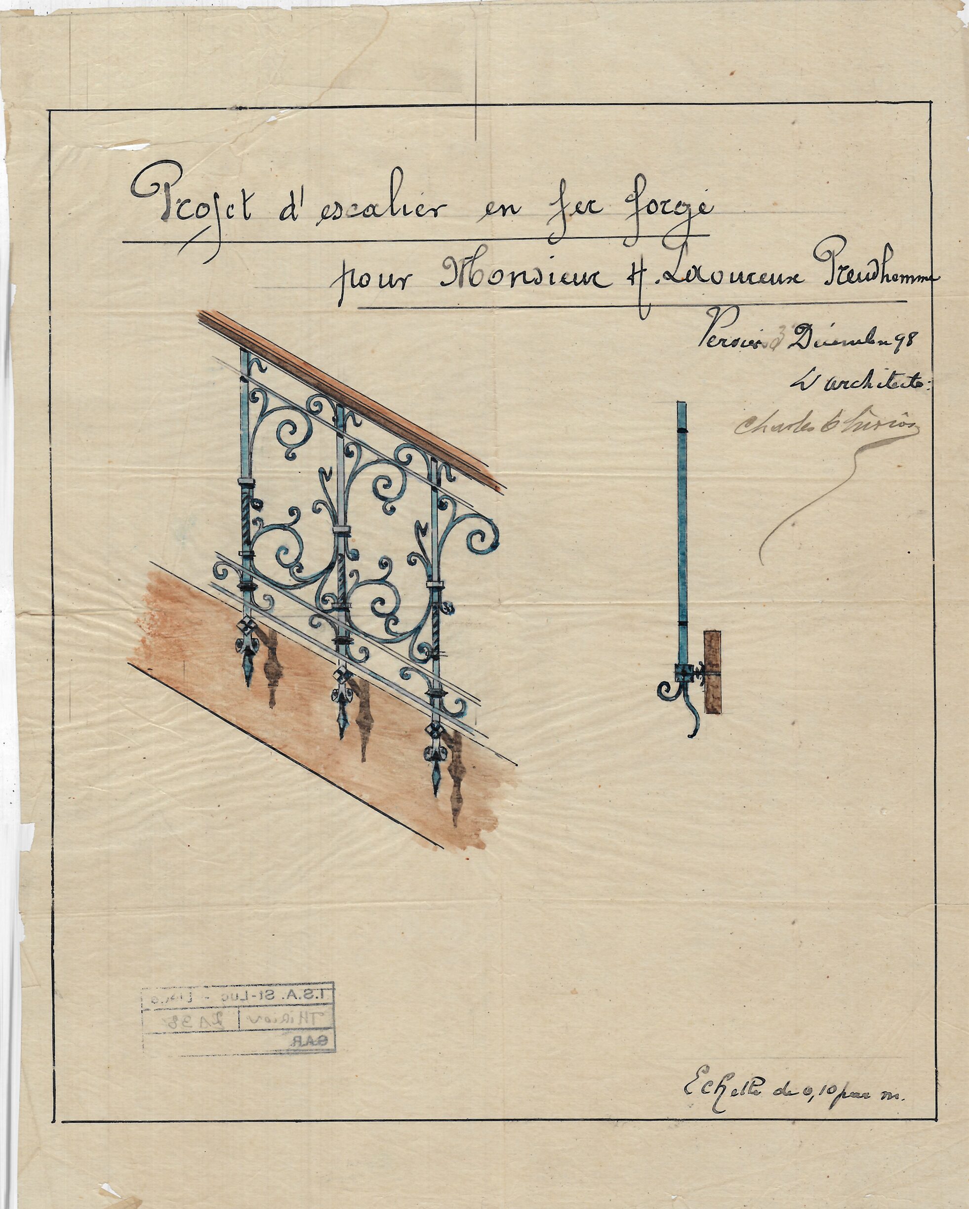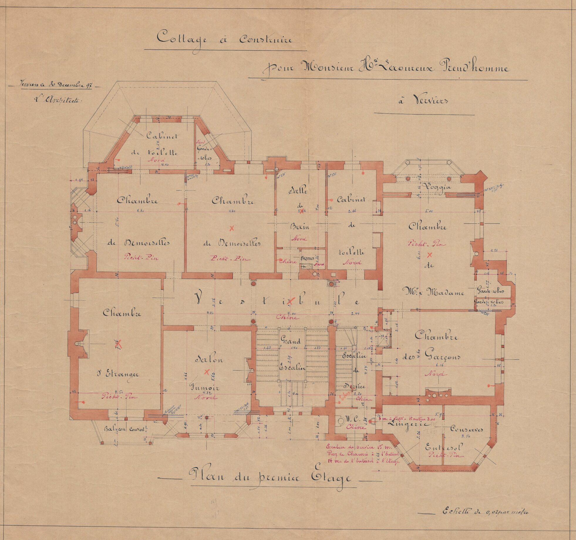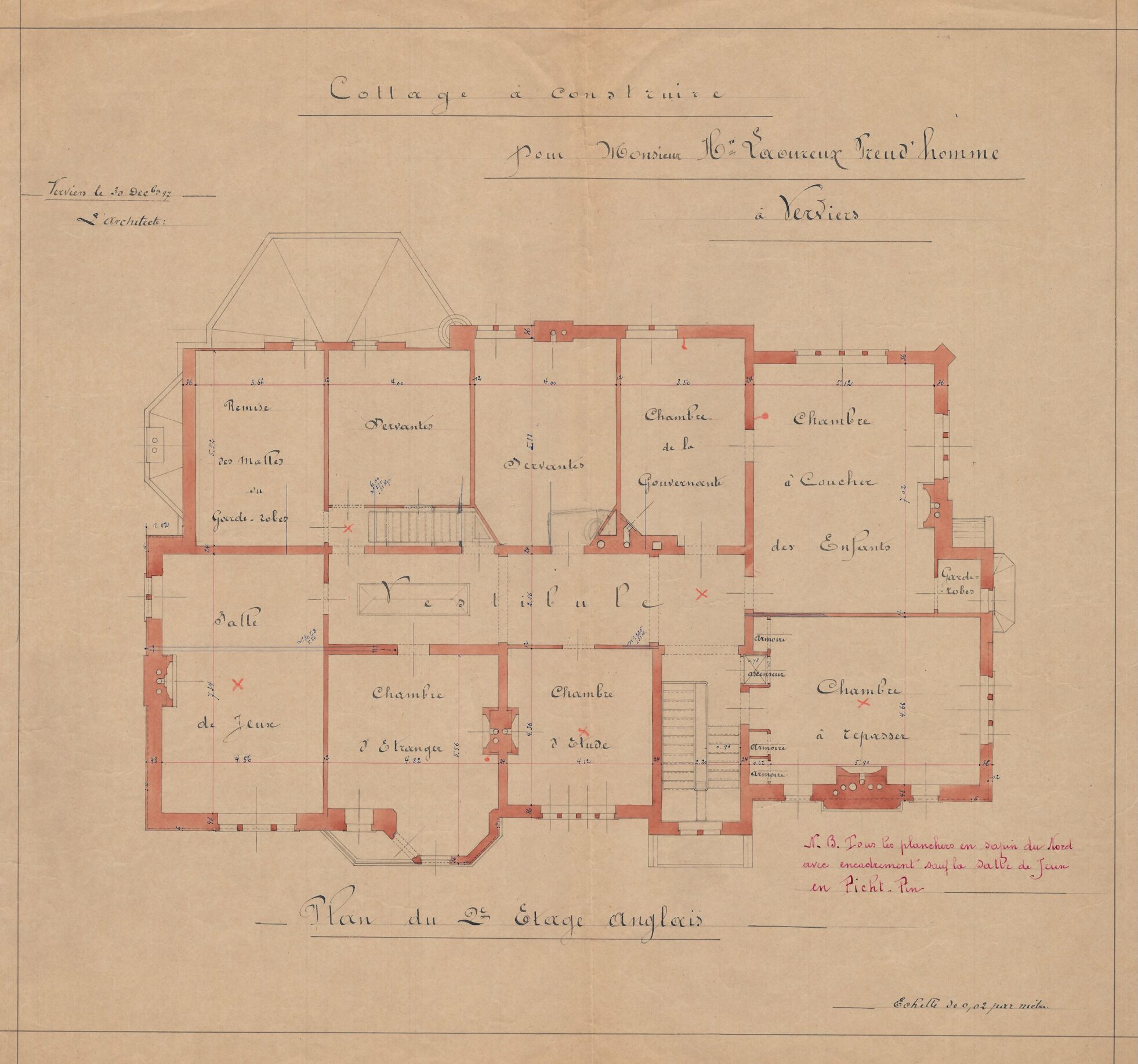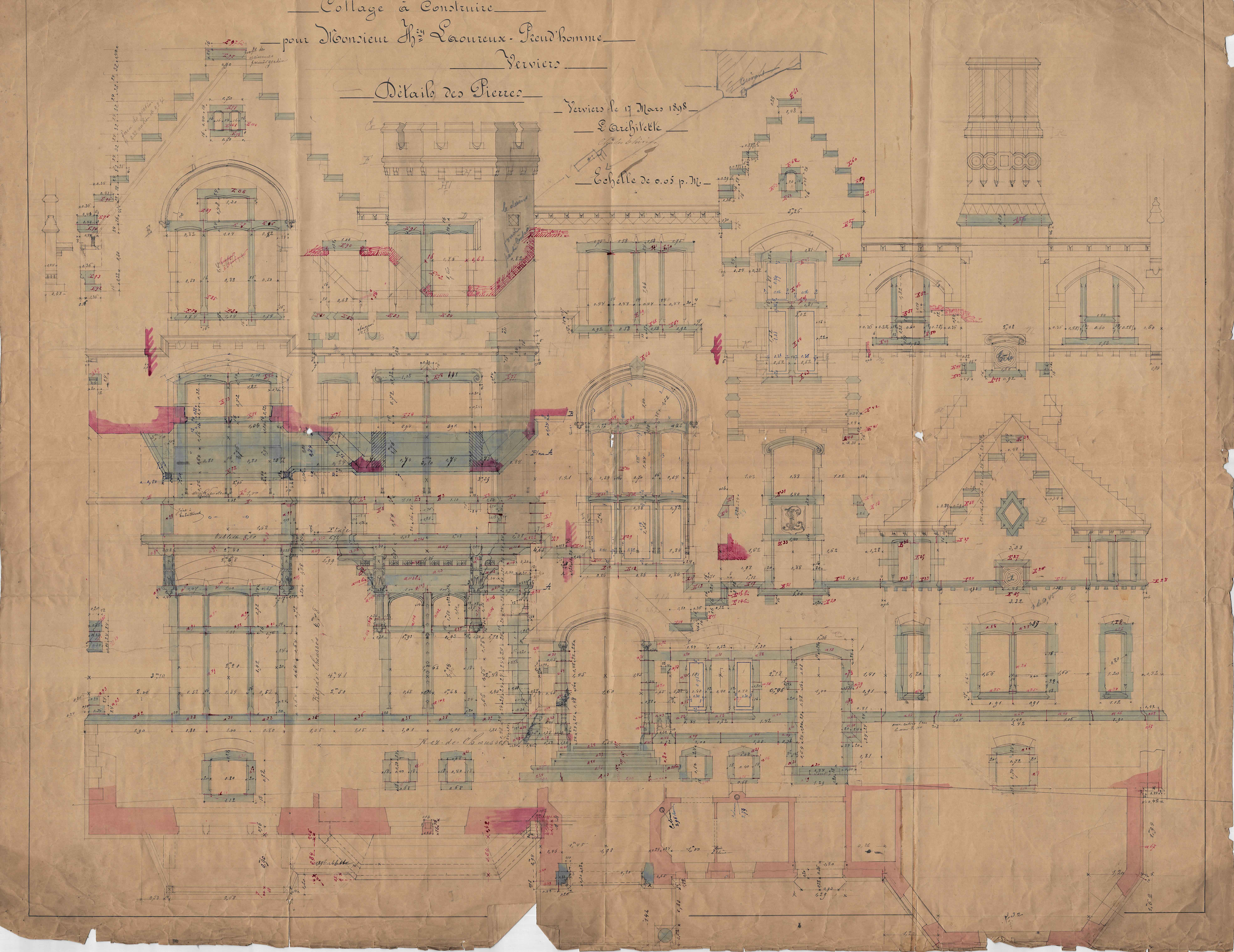 Contient plan du second étage anglais, coupes, dessins des plafonds, détails des menuiseries intérieures, des pierres, des ferronneries. Contient 24 documents.